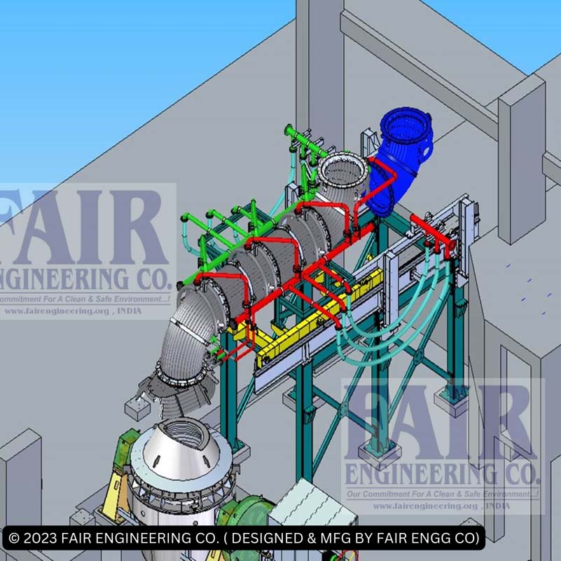 Fair Engineering Co. (FEC’s) designed FES system is useful to capture high temperature fumes emanating from AOD by placement of the water-cooled primary hood provided over the AOD vessel. Water-cooled ducting is provided to channelise the fumes to bag filter system. To help in movement of Overhead crane, pouring of molten metal from ladle the furnace needs to be tilted often, hence FEC has designed moveable hood and ducting on trolley, thereafter a fixed water-cooled duct with a fixed specified gap between secondary hood elbow flange and duct is made to facilitate fume suction. The water-cooled ducting can be of double walled or tubular design types.